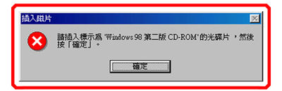 6.如果畫面出現緊告訊息要求放入系統光碟時,使用者務必確實放入該電腦作業系統版本的安裝系統光碟。(如圖10)