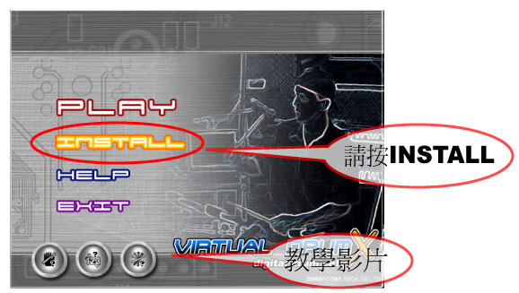 ◎當執行安裝主程式的時候,如果發現無法執行INSTALL的選項時,請檢查該電腦是否已安裝過VirtualDrumX,如果發現已安裝過VirtualDrumX,請先移除舊版VirtualDrumX,再重新執行安裝主程式即可。