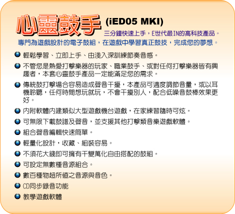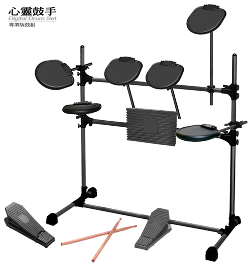 鼓架--鐵質噴漆 鼓皮---TPR(塑膠)包鐵板 鼓座---ABS 轉接頭---ABS加纖維 腳踏板---NYLONG66 線材---3.5ψ音源線 主機板,雙層印刷電路板 主機盒---ABS 蝴蝶螺絲---ABS包鐵 尺 寸:約80*80*40(CM) 重量/容量:約10公斤 顏色:黑色 材質:鐵質、塑膠